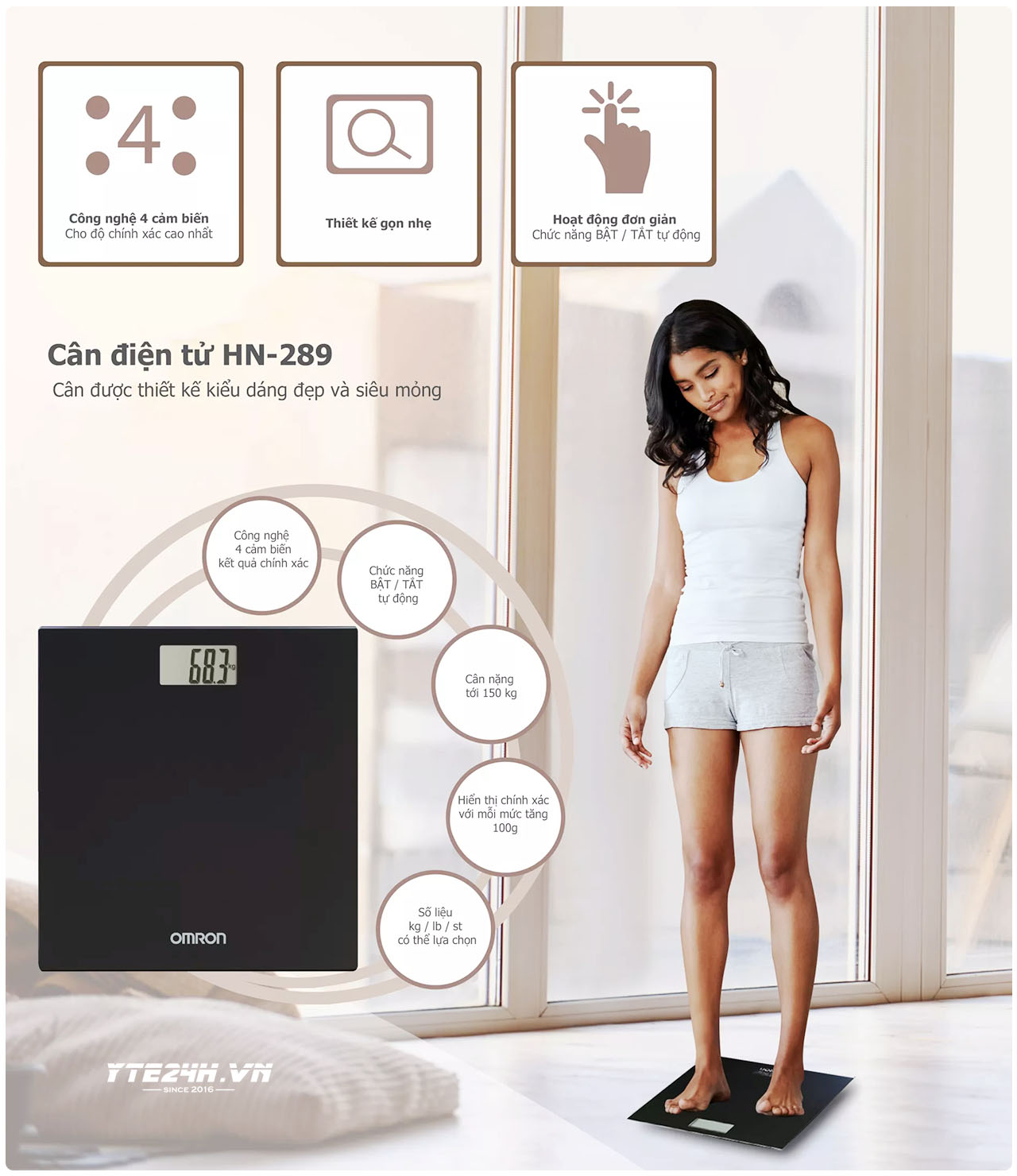 - Trọng lượng cân HN-289 nhẹ chỉ 1,2kg giúp bạn dễ dàng di chuyển khi sử dụng hay cất giữ thật nhẹ nhàng. Mặt dưới của cân điện tử Omron HN-289 có trang bị 4 cảm biến thông minh giúp cân nhanh chóng với kết quả cân chính xác, sai số chỉ 100g.