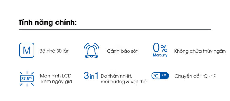 - Khi đo xong: Nếu kết quả đo bình thường thì có 1 tiếng “bíp” kéo dài (khoảng 1 giây)/ Nếu kết quả đo cao hơn 37,5°C (99,5°F) thì có 10 tiếng “bíp” ngắn.