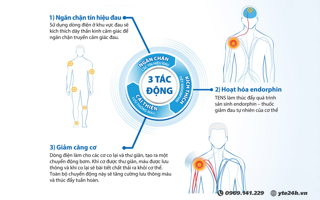 Máy TENS truyền xung điện qua da để kích thích các cảm nhận thần kinh tại vùng điều trị. Các xung điện này tác động trực tiếp đến cơn đau của bạn vừa làm giảm đau đồng thời giúp cơ thể tăng số lượng hooc môn endorphin được phóng thích.