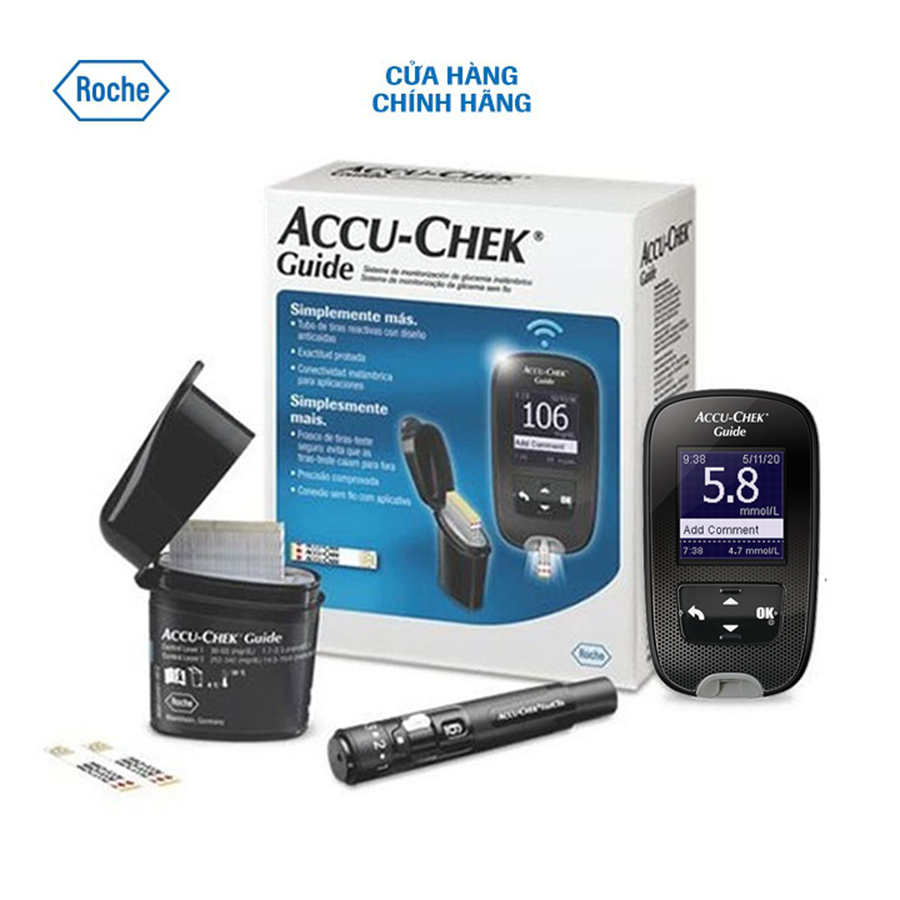 Máy đo đường huyết Accu-Chek Guide (đơn vị mmol/l hoặc mg/dl) là một trong những thiết bị đo đường huyết tốt nhất hiện nay với nhiều tính năng thông minh, cho kết quả cực nhanh và chính xác. Đây là thiết bị được dùng để định lượng nồng độ đường trong máu mao mạch toàn phần mới lấy từ đầu ngón tay, lòng bàn tay, cẳng tay và bắp tay, hỗ trợ theo dõi hiệu quả kiểm soát đường huyết.